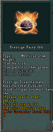• After character ≥ 60 could be join the event called defeating Fairy Autumn Blossom and whenever player chop the fairy every 50th times will obtain x1 Prestige Fairy Orb immediately.