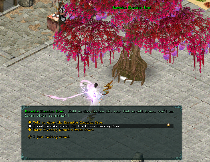• To wish player must meet the NPC and choose for "I want to make a wish for the Autumn Blessing Tree" and will consume for x1 Prestige Fairy Orb and x20 Holy Ices (per wish).