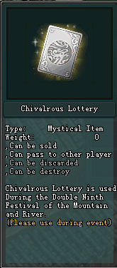 Reward: 300000 Exp / Chivalrous Lottery x 1 / Chivalrous Chest x 1