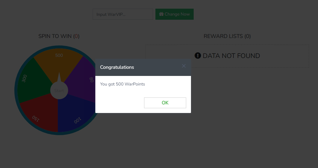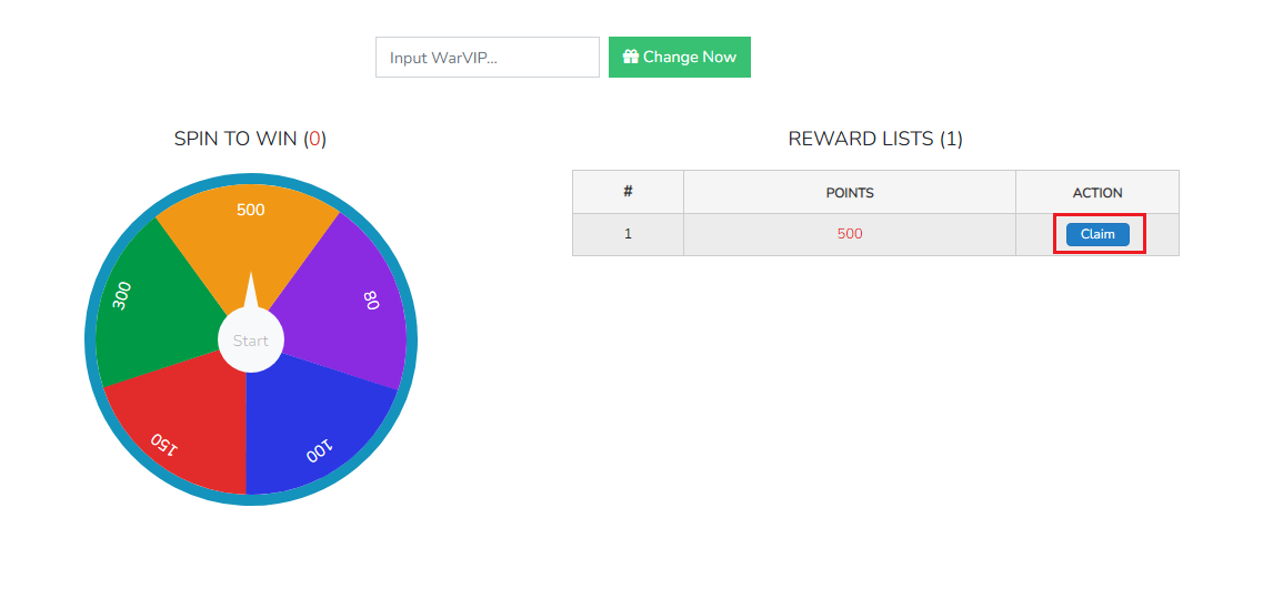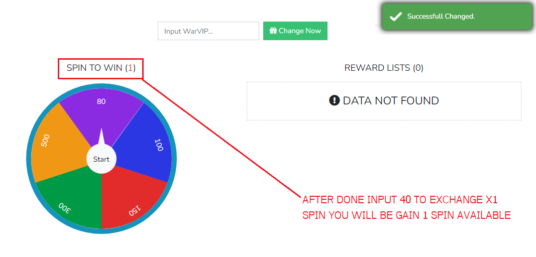 ប្រើពិន្ទុ WAR VIP POINTS របស់អ្នកដើម្បីផ្លាស់ប្តូរសម្រាប់ កងសំណាង(SPIN WHEEL) ដែលមាននៅលើគណនីវេបសាយ "MY ACCOUNT" ៕