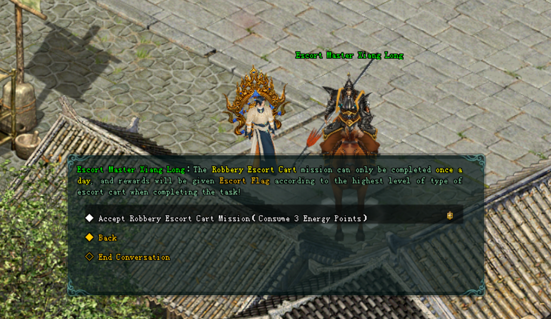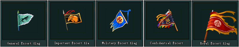 - ទង់រទេះ(Escort Flag) អាចផ្លាស់ប្តូរយក រទេះមួយផ្សេងទៀតពី NPC Escort Master Xiang Long ។