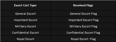 - ទង់រទេះ(Escort Flag) នីមួយៗ នឹងមានរង្វាន់ អាស្រ័យលើប្រភេទទង់ General Escort Flag គឺជារង្វាន់ទាបបំផុត ហើយទង់ Royal Escort Flag គឺជារង្វាន់ខ្ពស់បំផុត។