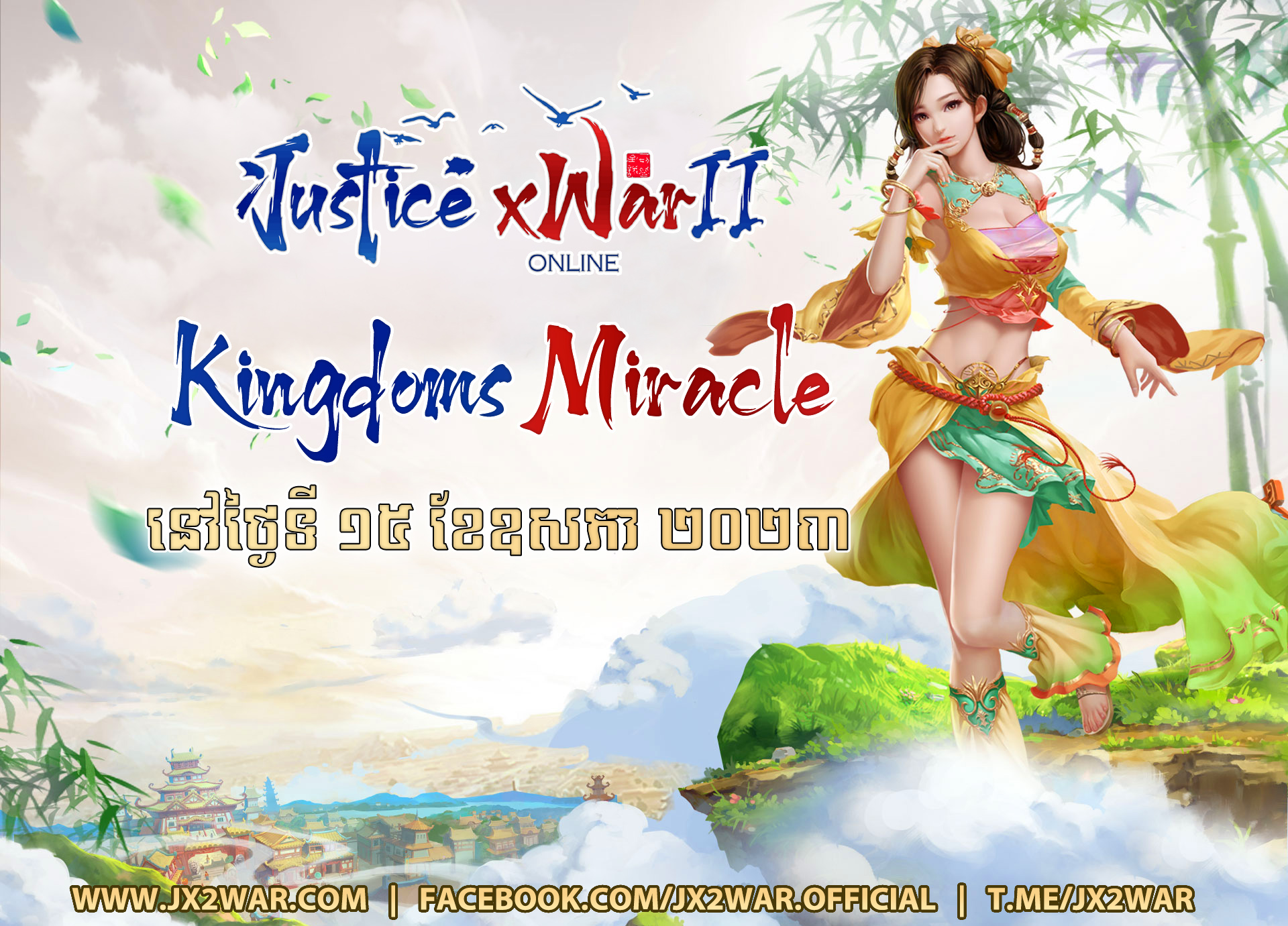 ដោយមានការគាំទ្រពី អ្នកកម្សាន្តជាច្រើន ជាមួយនិងឆ្លើយតប សំណូមពររបស់ អ្នកកម្សាន្ត នៅថ្ងៃទី15 ខែឧសភា ឆ្នាំ2023 Justice xWar2 នឹងធ្វើការបើកនគរថ្មីដែលមានឈ្មោះថា “Kingdoms Miracle” ហើយអ្នកកម្សាន្តអាចចូលលេងកម្សាន្តបាន នៅ វេលាម៉ោង 9:00 នាទី ព្រឹក។