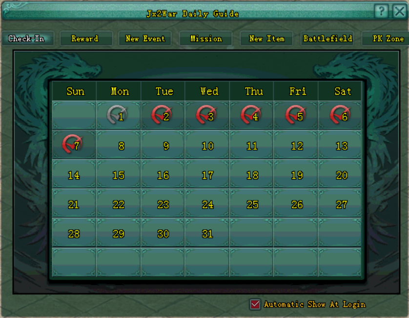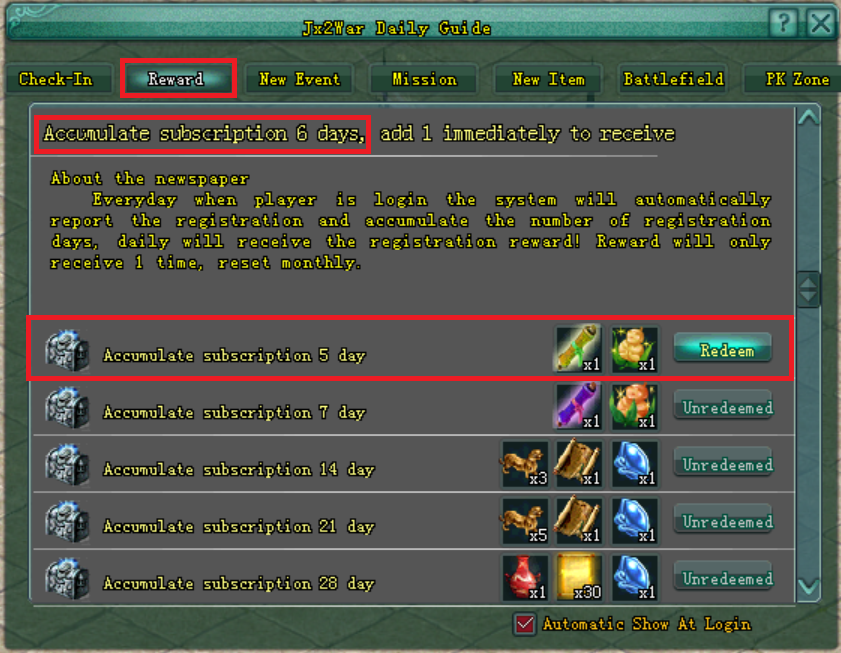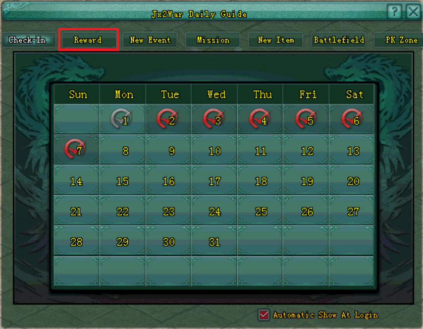 - បន្ទាប់មក វានិងបង្ហាញផ្ទាំង Jx2War Daily Guide រួចសូមធ្វើការចុច យក កន្លែង "Reward"
