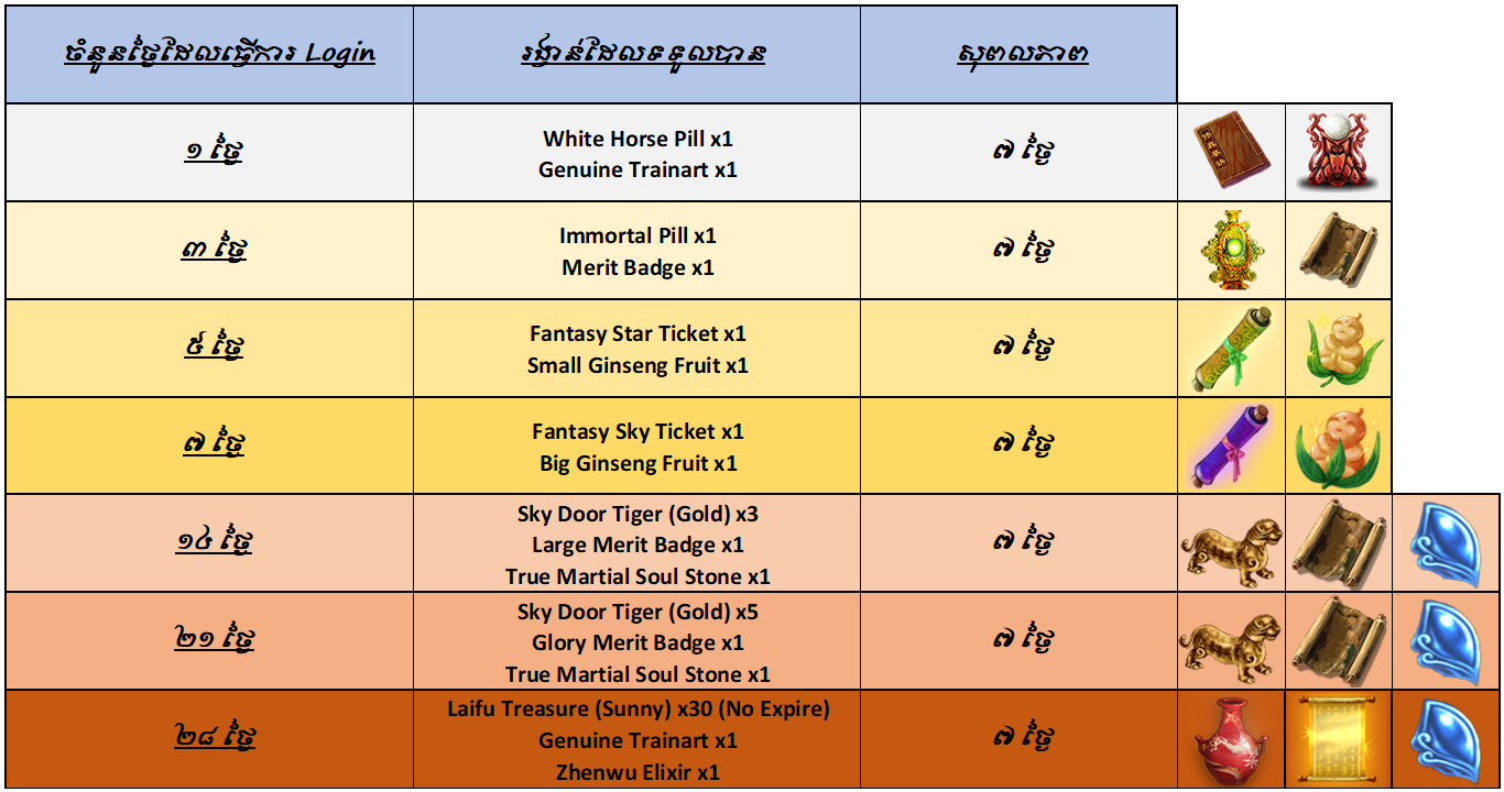 - ដើម្បីអាចចូលរួមក្នុងព្រឹត្តិការណ៍នេះគឺតម្រូវឲ្យតួអង្គធ្វើការ Login ជារៀងរាល់ថ្ងៃដើម្បីធ្វើការសន្សុំពិន្ទុទុក។