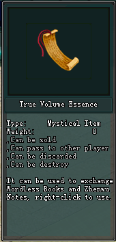 - True Volume Essence ដែលទទួលបានមកពីការ បំបែកសៀវភៅក្បាច់គុនបក្ស អាចយកមកធ្វើការផ្លាស់ប្តូរសម្រាប់ Wordless Bible និង Zhenwu Notes ។