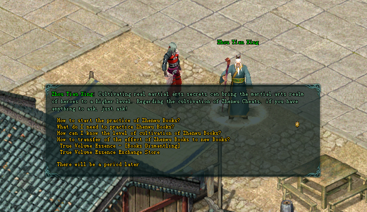 - សាត្រាស្លឹករឹត ឥទ្ធិពលគម្ពី ZhenWu Tattoo ដែលបានហ្វឹកហាត់រួចរាល់ តួអង្គអាចធ្វើការផ្ទេរទៅកាន់ គម្ពីថ្មីបាន ដោយគ្រាន់តែ ធ្វើការ ចុច Mouse ខាងស្ដាំ ទៅលើ ZhenWu Notes ដែលអាចប្ដូរបានពីហាង របស់តួអង្គ Zhuo Tian Xing NPCs (ផែនទី XiangYang 178/189) រួចធ្វើការចុច លើ "Confirm" ដើម្បីធ្វើការ ខាបយក ឥទ្ធិពលគម្ពី ZhenWu Tattoo ចេញមកបាន។