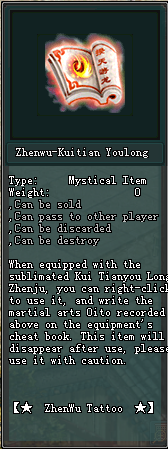- ដើម្បីធ្វើការអនុវត្ត ZhenWu Tattoo ចូលទៅកាន់គម្ពីបក្សថ្មីមួយផ្សេងទៀត នៅពេលដែលតួអង្គធ្វើការដកយកមកនូវ ឥទ្ធិពល ZhenWu Tattoo តួអង្គនិងទទួលបាន "សាត្រាស្លឹករឹត ឥទ្ធិពលគម្ពី(ZhenWu Tattoo Record)"។